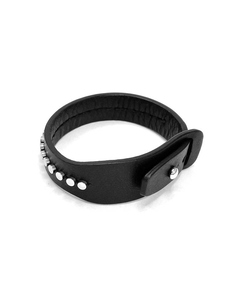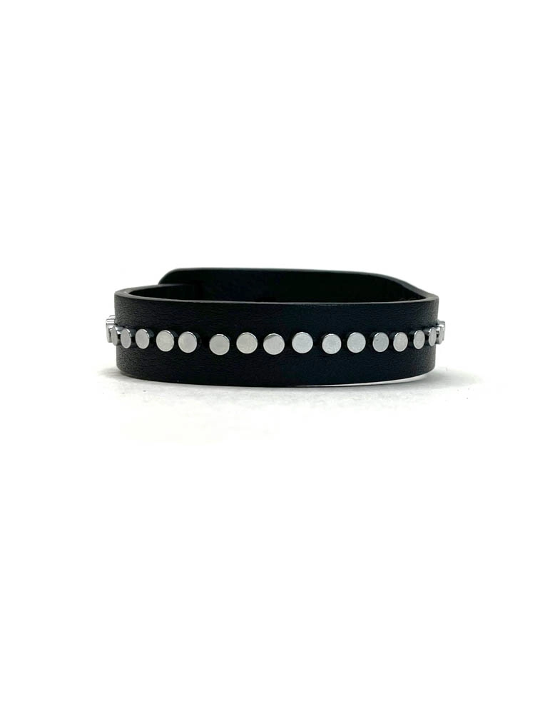 Браслет из чёрной кожи расшитый серебряным гематитом.