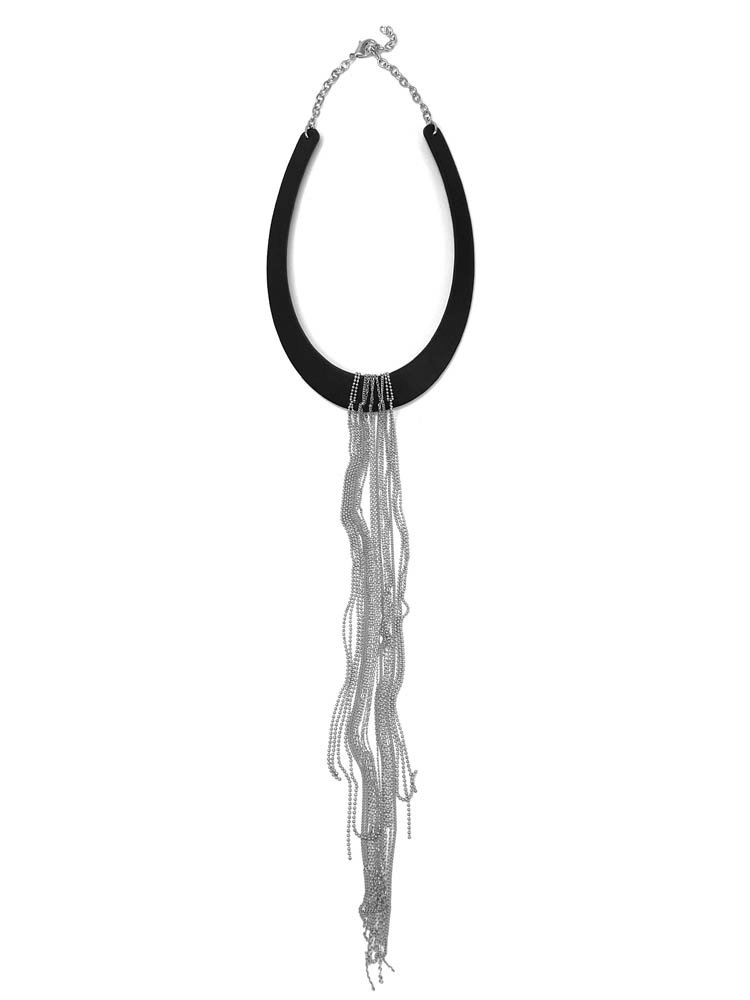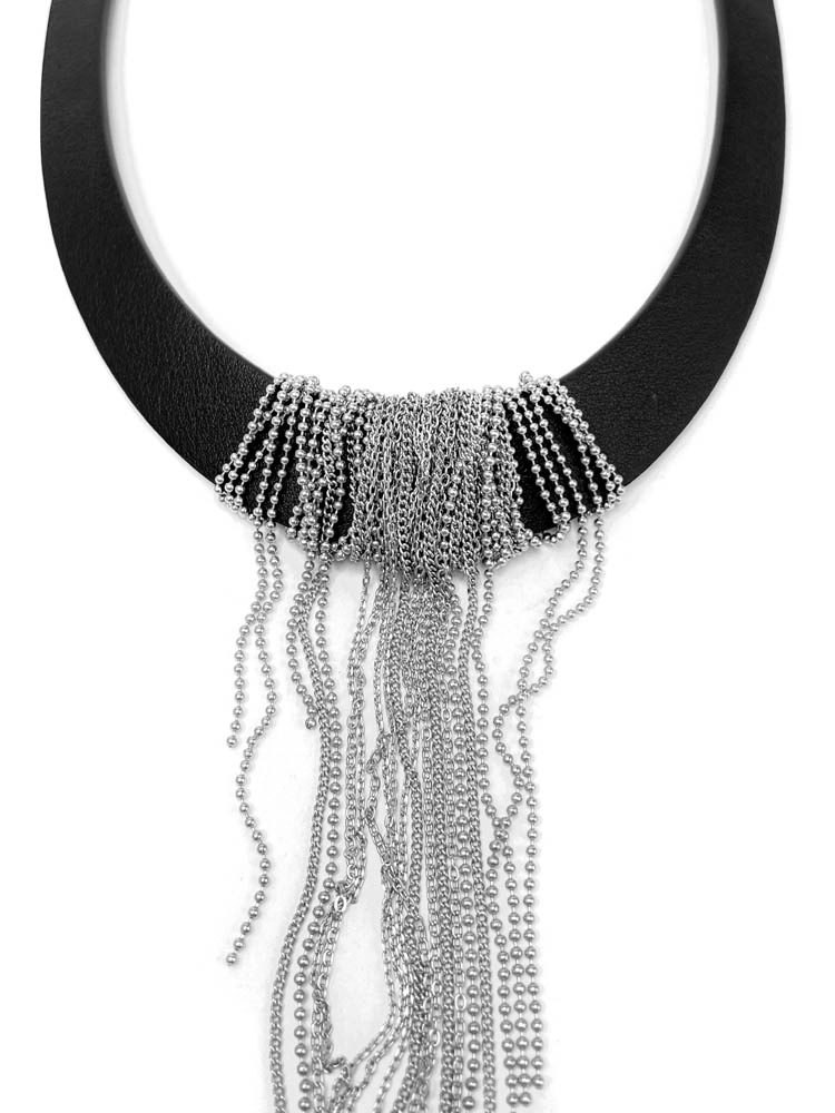 Колье из кожи БРИЗ из чёрной кожи с цепочками цвет серебро