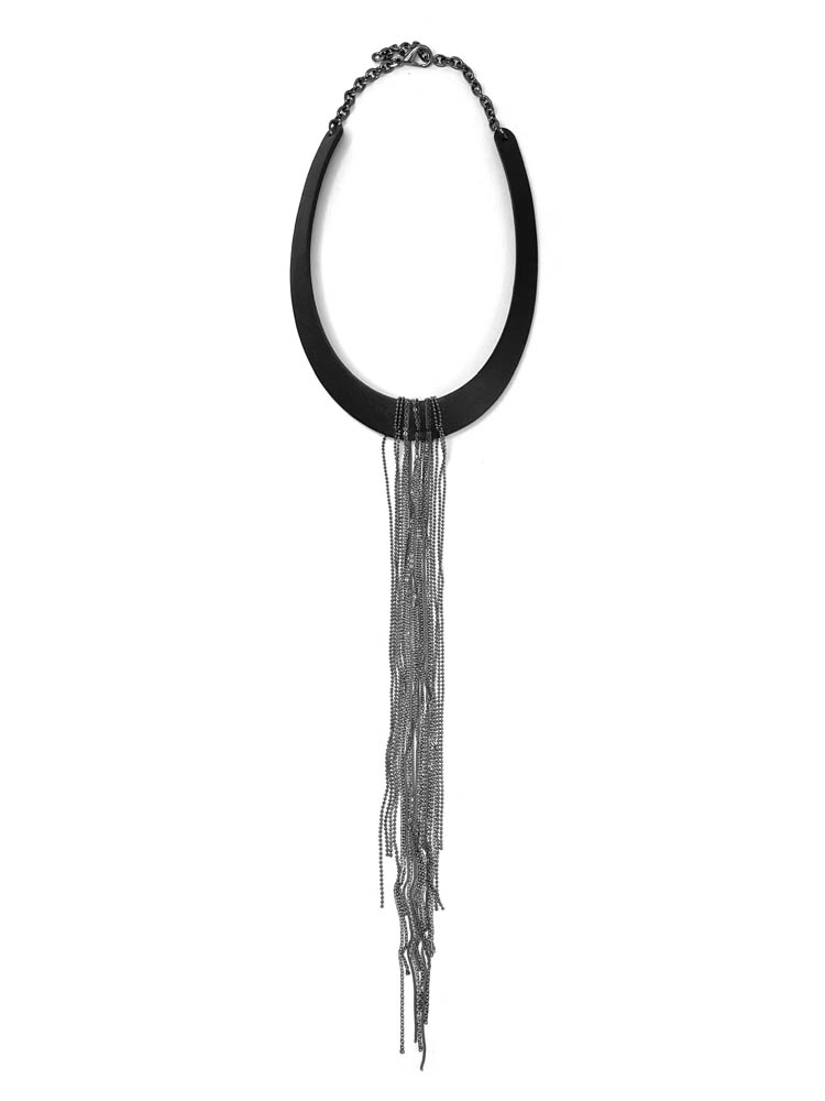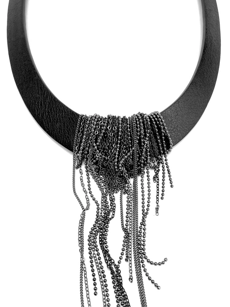 Колье из кожи БРИЗ из чёрной кожи с цепочками цвет тёмное серебро