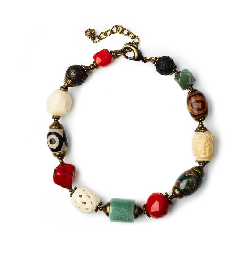 Колье ЭКЛЕКТИКА. Материалы: коралл красный и белый, нефрит, агат, вулканическая лава, кость, бронза.