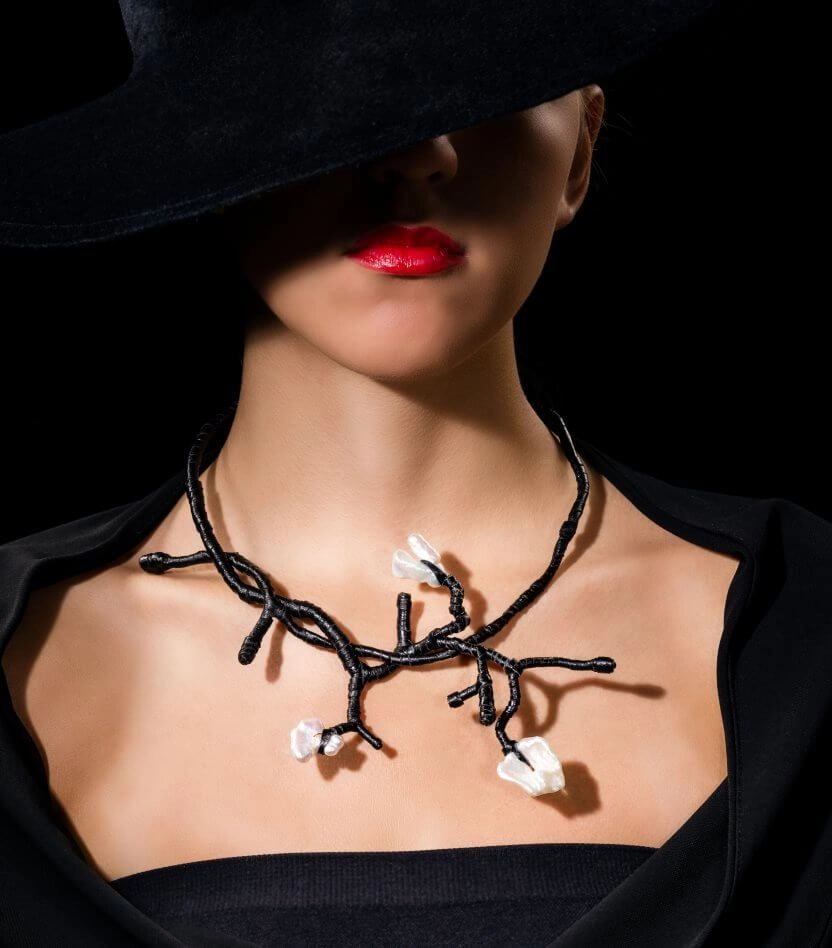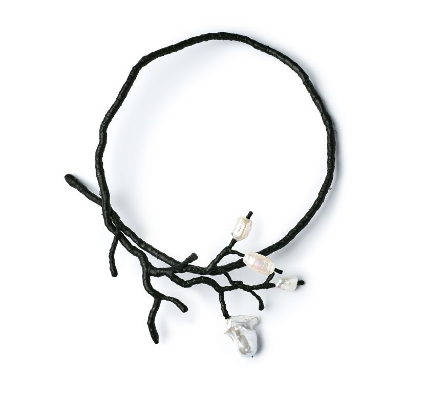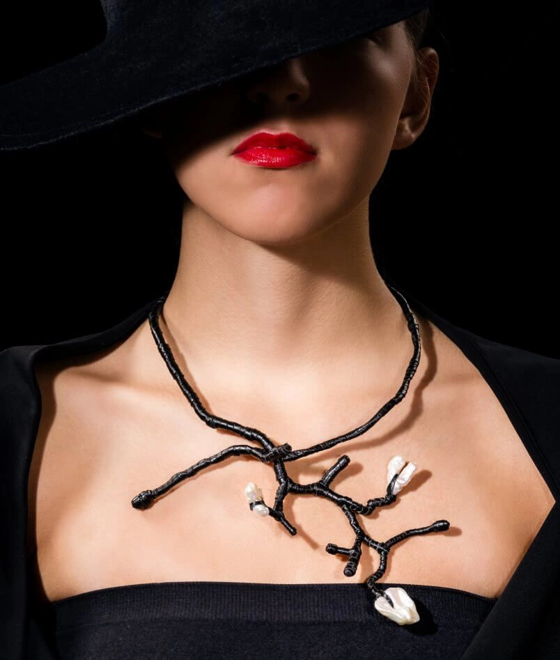 Колье трансформер из тонкой кожи ягненка с натуральным жемчугом.