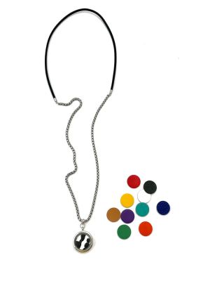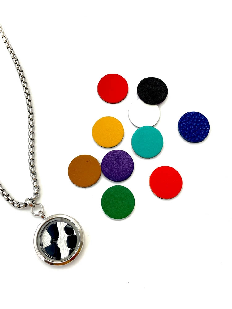 Кулон из кожи СТЕКЛЯННЫЙ КРУГ 2 трансформер со сменными вставками. В комплекте 9 цветных - черный, белый, желтый, оранжевый, красный, синий, голубой, бирюзовый, фиолетовый