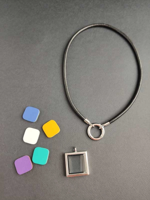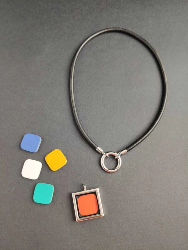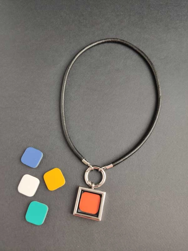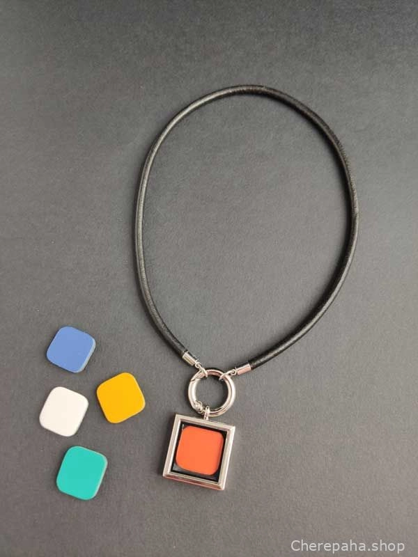 Кулон из кожи СТЕКЛЯННЫЙ КВАДРАТ трансформер со сменными вставками. В комплекте 10 цветных - черный, белый, желтый, оранжевый, красный, синий, голубой, бирюзовый, фиолетовый