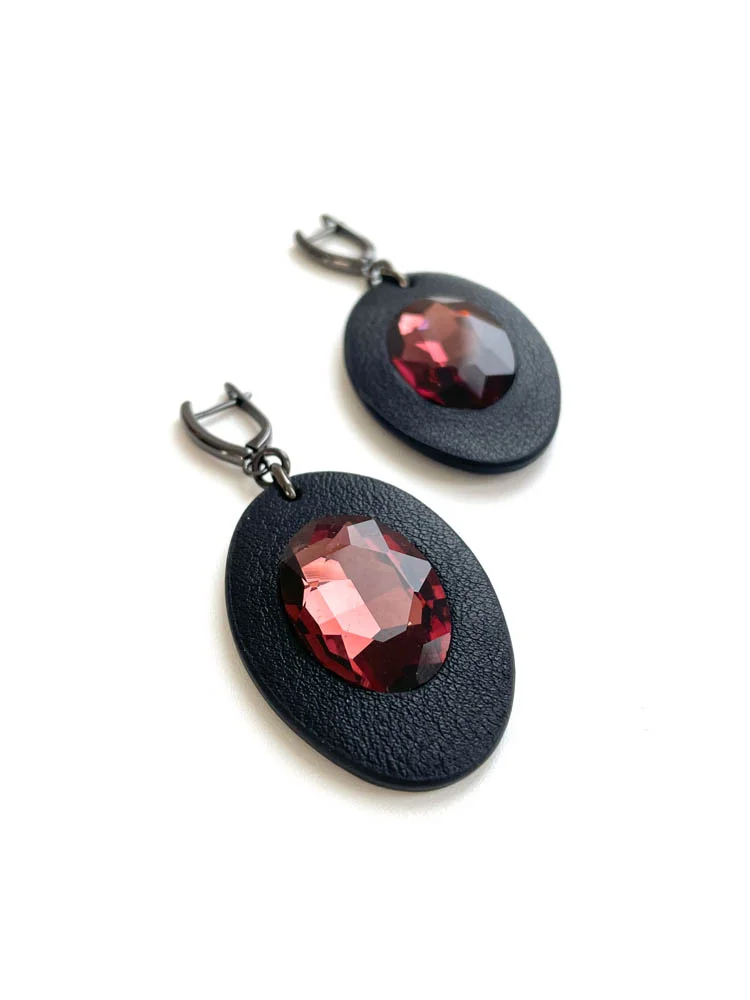Серьги КРИСТАЛЛ ОВАЛ винный на коже чёрного цвета.