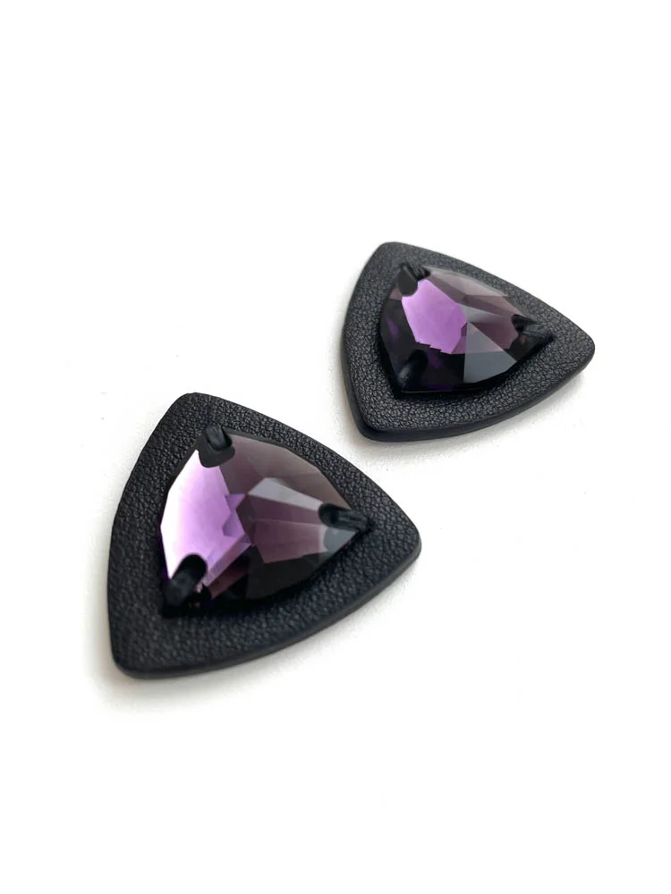 Серьги КРИСТАЛЛ ТРЕУГОЛЬНИК лавандовый на коже чёрного цвета.